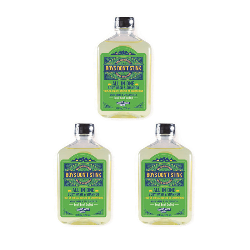 The Boys Don’t Stink All-In-One 3 PK keeps active kids fresh from head to toe with zero fuss. Each 12oz bottle is packed with our bestselling Warm Amber & Spice scent and works double duty as a shampoo and body wash, making cleanup fast, easy, and actually fun. Tough enough to banish sweat, grass stains, and locker room smells, yet gentle on young skin and hair, this is the ultimate grab-and-go wash routine for school days, sports nights, and every muddy adventure in between. Stock up, gift it, or keep a bottle in every bathroom — because boys really don’t have to stink.