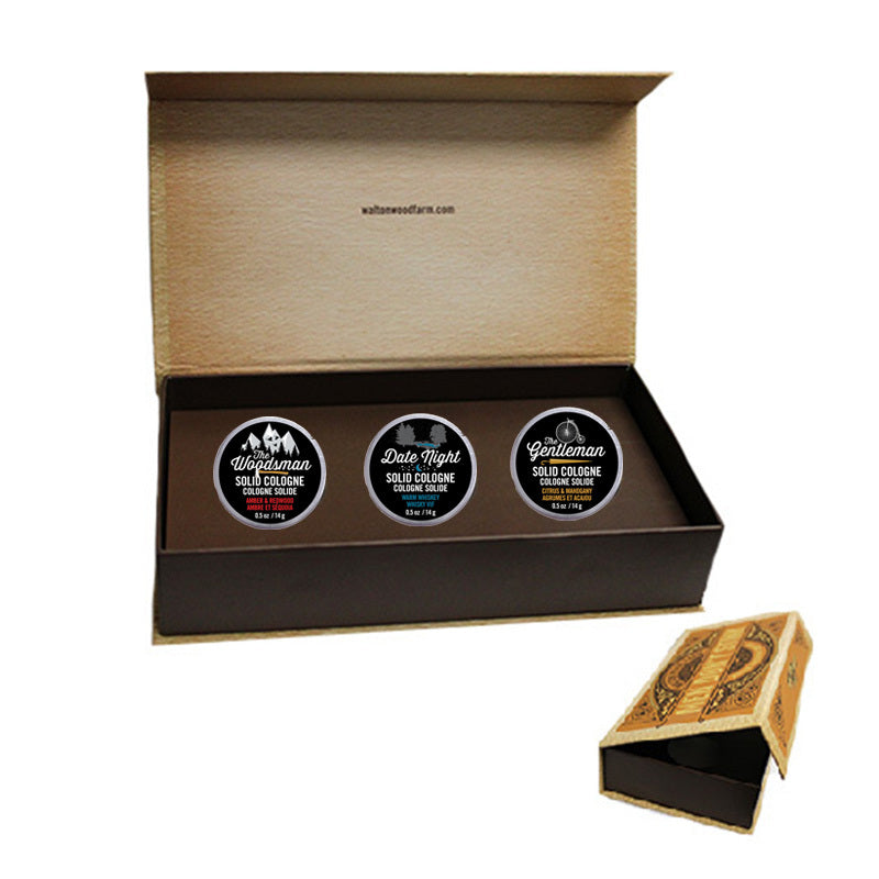 This set includes three 0.5 oz solid colognes: Date Night with a warm whiskey scent, The Woodsman featuring rich amber and redwood notes, and The Gentleman in a fresh yet refined citrus & mahogany blend. Compact and mess-free, these solid colognes are perfect for travel, gym bags, or on-the-go touch-ups. Packaged in a sleek gift box, this set makes an ideal gift—or an easy way to find a favourite scent.