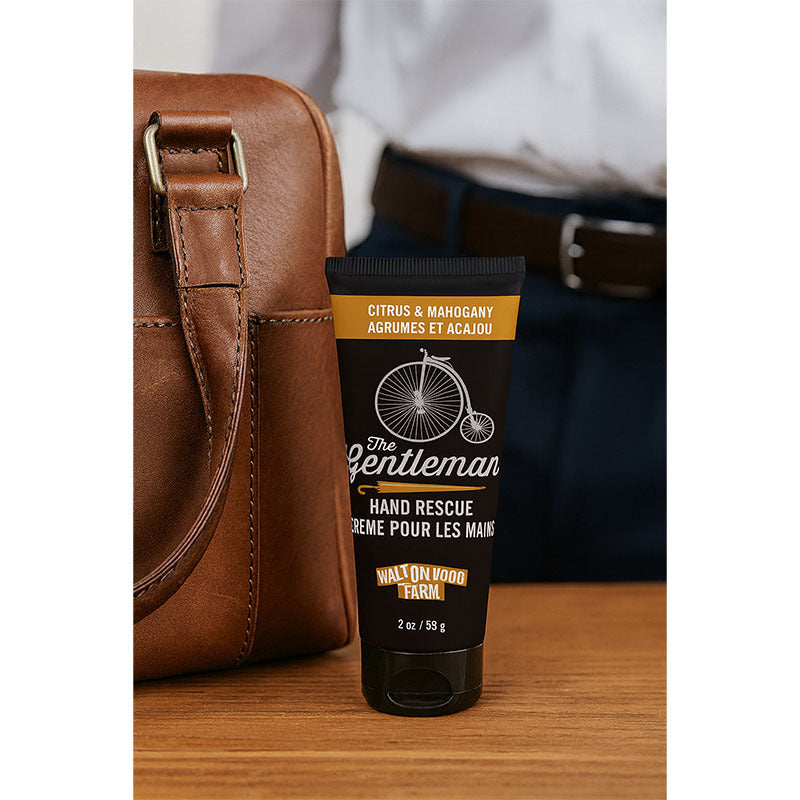 Sophistication in a tube. Same rich, deeply nourishing formula, now in a convenient 2oz tube. The Gentleman Hand Rescue combines rich hydration with a refined Citrus & Mahogany scent, keeping hardworking hands soft, smooth, and impeccably groomed—because a true gentleman never compromises on care.