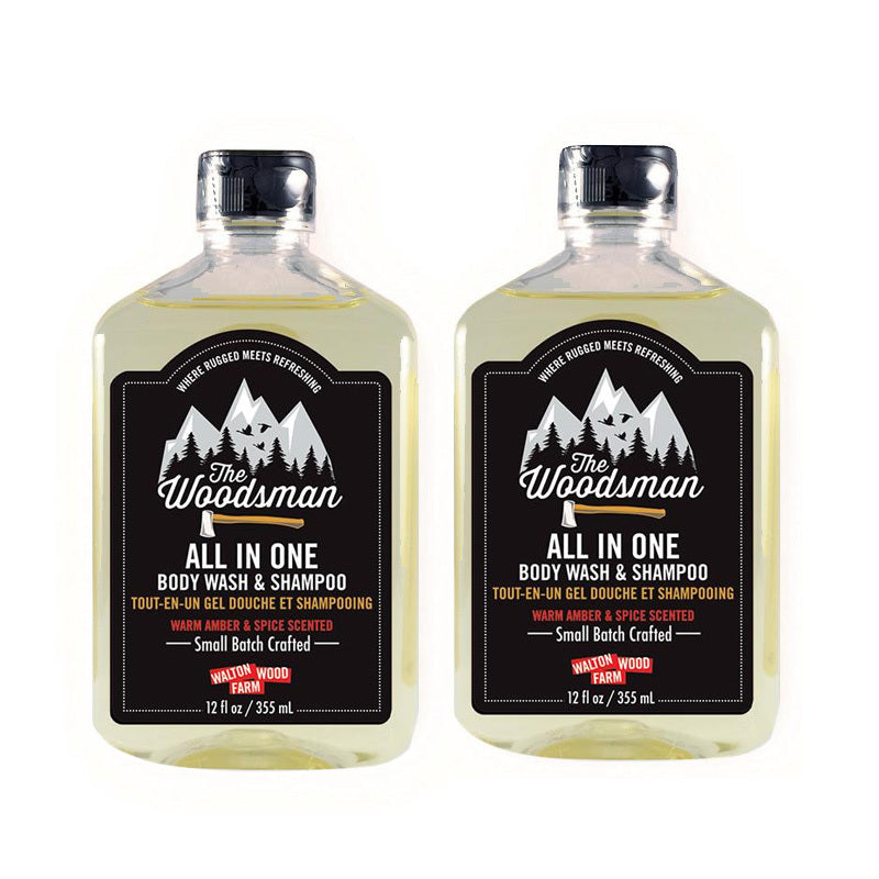 The Woodsman All-In-One 2-Pack features two 12oz bottles of our body wash and shampoo combo, crafted for a rugged, no-nonsense clean. Warm Amber and Spice notes deliver a rich, woodsy scent while the all-in-one formula cleanses hair and skin without over-drying. Built for those who prefer the outdoors to the ordinary—and a routine that works as hard as they do.