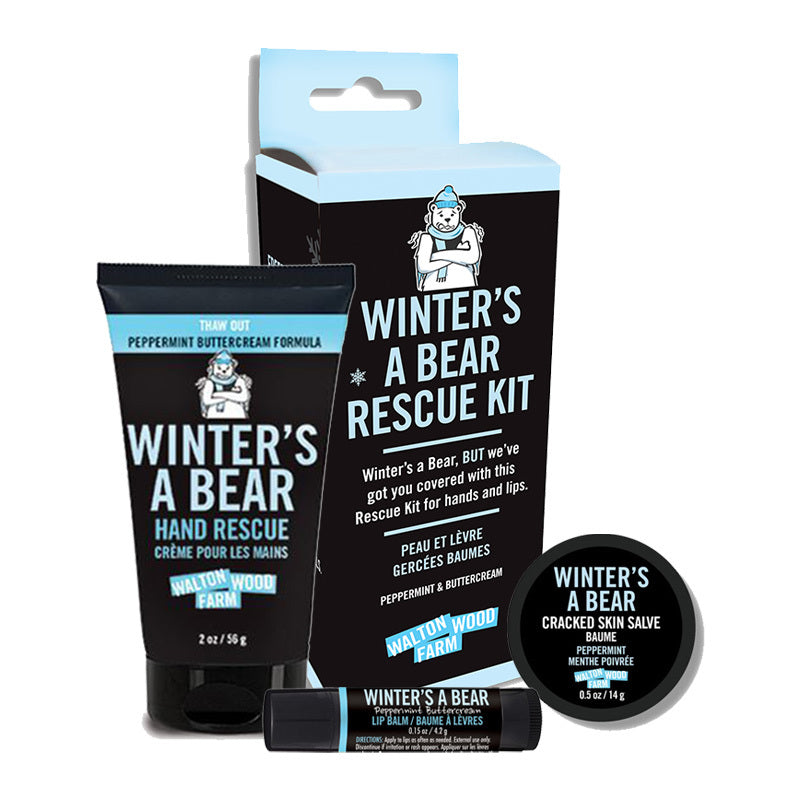 Small but mighty cold-weather essentials bundled for serious skin relief and cozy vibes. Featuring a Peppermint & Buttercream swirl—cool tingle meets sweet comfort—each product is built to hydrate, protect, and fix the flakes winter leaves behind. Our Winter's a Bear Rescue Kit includes nourishing lip balm, cracked skin salve, and a 2oz hand rescue tube.
