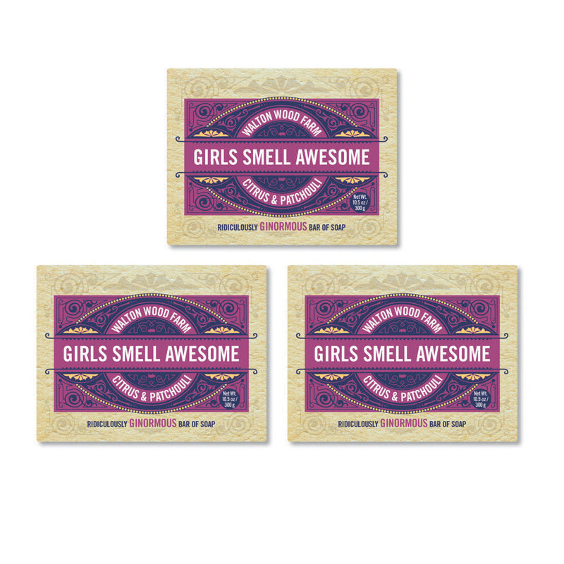 Girls Smell Awesome Soap Bar 3-Pack features two 10.5oz soap bars designed for a long-lasting, skin-loving clean. Fresh Citrus pairs with soft Patchouli for a bright, slightly sweet scent that feels cheerful and cozy at the same time. Rich lather and a generous size make this duo perfect for everyday use—keeping skin clean and smelling awesome.