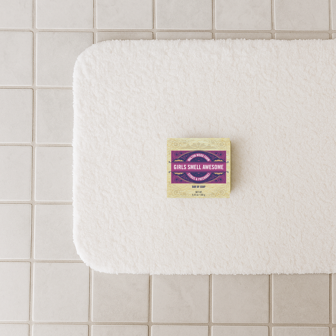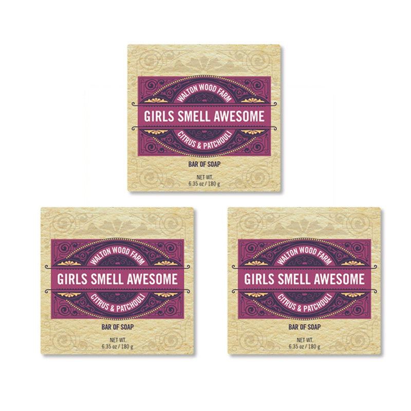 Girls Smell Awesome Soap Bar 3-Pack includes three 6.35oz Soap Bars crafted for a gentle, everyday clean. Bright Citrus notes blend with soft Patchouli to create a fresh, slightly sweet scent that feels both fun and comforting. Rich lather leaves skin clean, smooth, and smelling awesome—because even the little things should feel special.