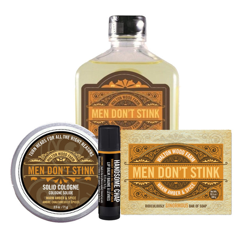 It includes our Men Don’t Stink All-In-One Body Wash & Shampoo for a clean, efficient shower routine, paired with the Warm Amber & Spice 10.5oz Soap Bar for a rich, masculine lather. The Men Don’t Stink 2.5oz Solid Cologne adds long-lasting scent without overpowering, while the Handsome Chap Lip Balm keeps lips comfortable and hydrated year-round.
