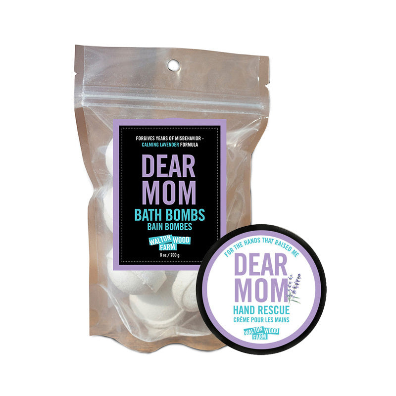 This set includes Dear Mom Bath Bombs for a relaxing soak and Dear Mom Hand Rescue to deeply nourish tired, overworked hands. Both are infused with a soothing Lavender scent, known for its calming, comforting properties.